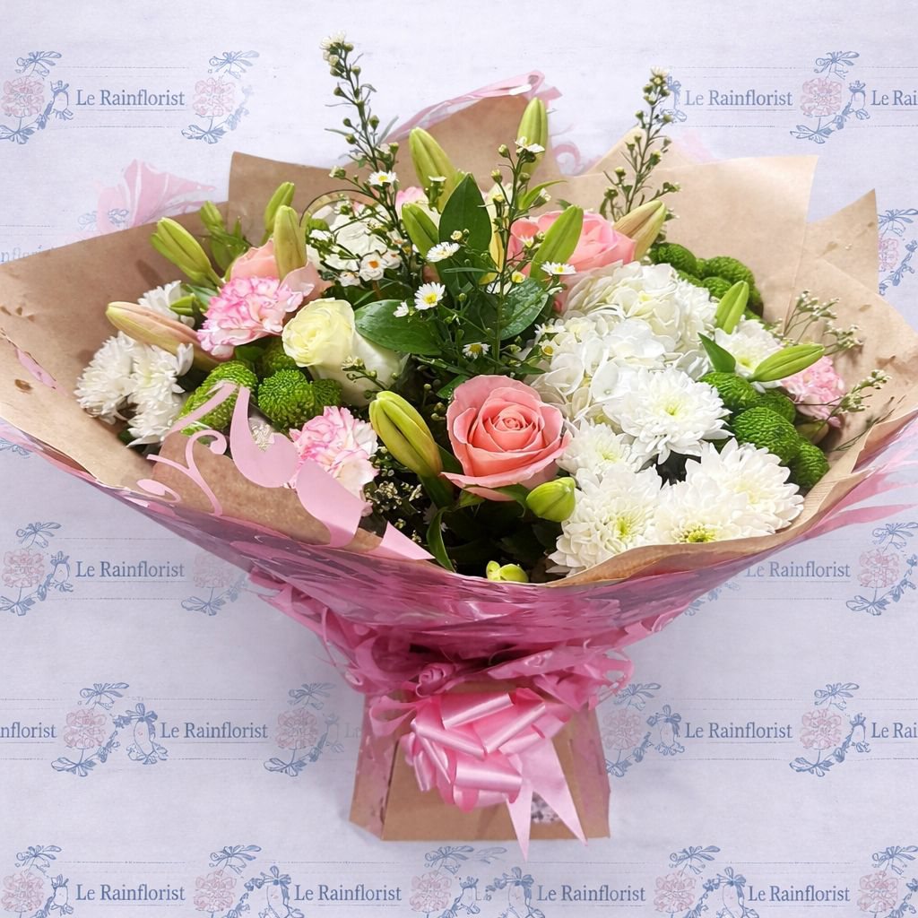 A beautifully soft, luxury bouquet in pinks, creams and fresh greens – available in two generous sizes.